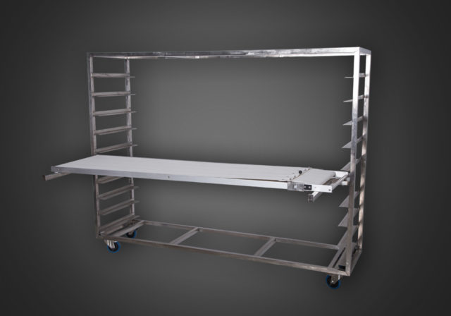 Cărucior inoxidabil cu lădițe de plastic pentru pâine ciabata